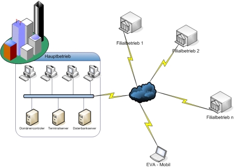 In der heutigen Zeit wird es immer wichtiger, Arbeitsprozesse zu optimieren und Ressourcen zu bündeln. Informationen sind wichtiger denn je. Mit Eva Zentral stellen wir einen zentral orientierte Verkäufer Arbeitsplatz zu Verfügung. Alle Daten werden auf einem zentralen Server gespeichert und nicht wie bisher in jedem einzelnen Gruppenbetrieb. Der Zugriff auf EVA erfolgt dann lediglich über eine Remote Desktop Verbindung. Dabei wird die Funktionalität der Microsoft Terminaldienste genutzt. Die Clients dienen lediglich zur Dateieingabe und –ausgabe. Daher wird auf den einzelnen Clients keine EVA Software installiert. Hohe Kosten für Installation und Wartung, wie bei einem dezentralen System entfallen dadurch.